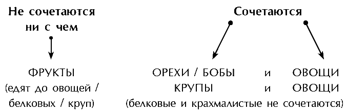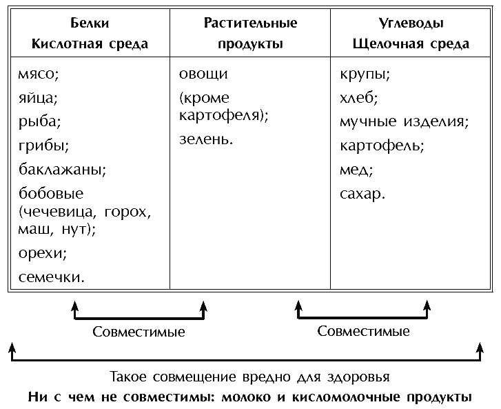 Белковые продукты не совмещаются с углеводами. Овощи и зелень совместимы и с белковыми, и с углеводными продуктами. Молоко и все кисломолочные продукты не совмещаются ни с чем. Фрукты и ягоды также нельзя совместить с другими продуктами, и даже друг с другом. Отдельный сорт фрукта несовместим с другими сортами, с ягодами та же история. Желательно за раз есть один вид фруктов или ягод.