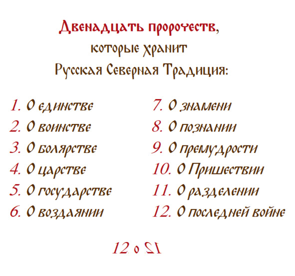 В лоне Традиции многие века передают ведение о ДВЕНАДЦАТИ ПРОРОЧЕСТВАХ. Учитель рассказывает о них ученику в точности, как слышал от Учителя своего, а тот – от своего, и так далее.