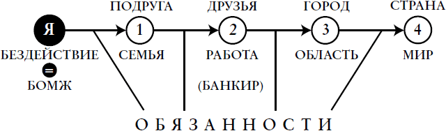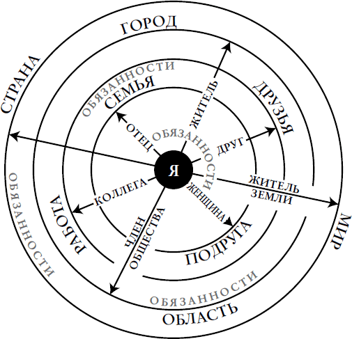 Представьте свою жизнь в виде набора концентрических окружностей: от маленького круга, вписанного в больший, а тот – в ещё больший. Каждый круг – роль. В центре точка – это вы. Следующий круг – семья или лица противоположного пола, с которыми вы имеете удовольствие заниматься сексом, ведомые, естественно, инстинктом размножения. Далее – круг небольших групп по интересам: преферанс, альпинизм, работа – куда же без нее. Следующий круг – город, в котором живёшь. А другой можно ограничить страной, но лучше уж всем человечеством.