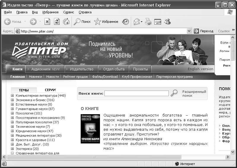 Подключиться к Интернету – только полдела. Для путешествий по Глобальной сети понадобится браузер – программа, позволяющая совершать просмотр веб-страниц, переход по ним, их сохранение и пр. Например, в состав операционных систем семейства Windows входит встроенный браузер Internet Explorer (рис. 1.2), который сегодня является самым популярным в силу распространенности операционной системы Windows. Чтобы запустить Internet Explorer, нужно выполнить команду Пуск → Все программы → Internet Explorer.