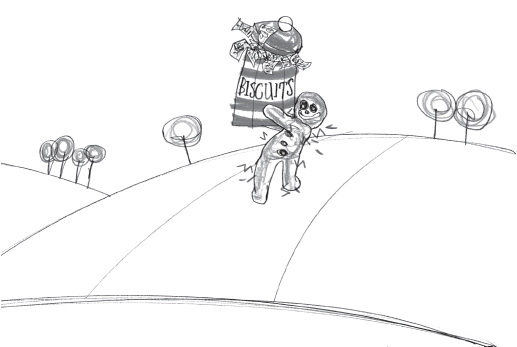 And then, sure enough, something did happen. A little figure appeared over the top of Boaster’s Hill. It was the strangest little man Polly had ever pointed her eyes at. For a start, he was only 15.24 centimetres tall. And he was made entirely out of gingerbread, with raisins for eyes. And he had electric muscles so he could walk around like you or me, and blue sparks came off him whenever he moved. And what’s more, he carried an enormous biscuit tin and it was stuffed full of money. And as you know, money is worth a lot of money. And there was an awful lot of money in that tin, and that’s a fact.