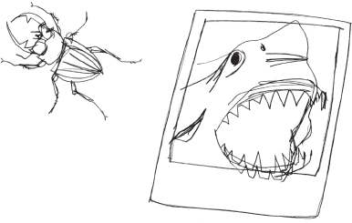 Then he scruffed up his big red beard to make it as wild and frightening as possible. It wasn’t quite terrifying enough so he stuck a couple of beetles in it and a photo of a shark.