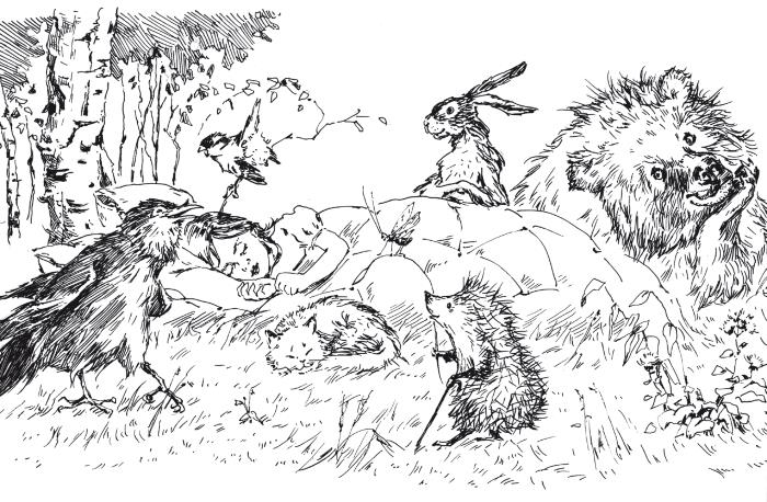 – Ой, батюшки! Пришёл в наше болото медведь и завалился спать. Как лёг в траву, так сейчас же задавил пятьсот комаров; как дохнул – проглотил целую сотню. Ой, беда, братцы! Мы едва унесли от него ноги, а то всех бы передавил.