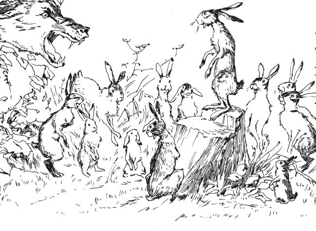 Совсем близко подошёл волк к разыгравшимся зайцам, слышит, как они над ним смеются, а всех больше – хвастун Заяц – косые глаза, длинные уши, короткий хвост. «Э, брат, погоди, вот тебя-то я и съем!» – подумал серый Волк и начал выглядывать, который заяц хвастается своей храбростью. А зайцы ничего не видят и веселятся пуще прежнего. Кончилось тем, что хвастун Заяц взобрался на пенёк, уселся на задние лапки и заговорил: