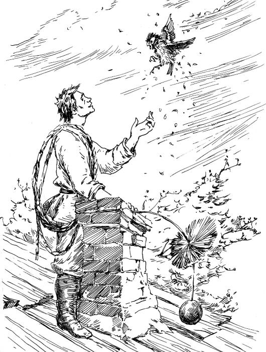 – Позвольте, дяденька, – послышался в толпе птиц тоненький голосок. Птицы раздвинулись и пустили вперёд Бекасика-песочника, который подошёл к самому трубочисту на своих тоненьких ножках.