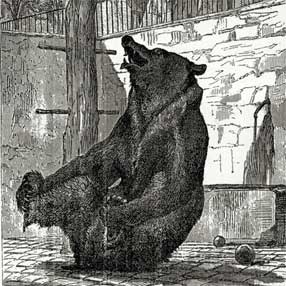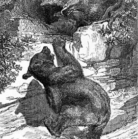 Медвежонок поселился у меня и в течение целого дня забавлял публику, как больших, так и маленьких. Он так забавно кувыркался, всё желал видеть и везде лез. Особенно его занимали двери. Подковыляет, запустит лапу и начинает отворять. Если дверь не отворялась, он начинал забавно сердиться, ворчал и принимался грызть дерево своими острыми, как белые гвоздики, зубами.