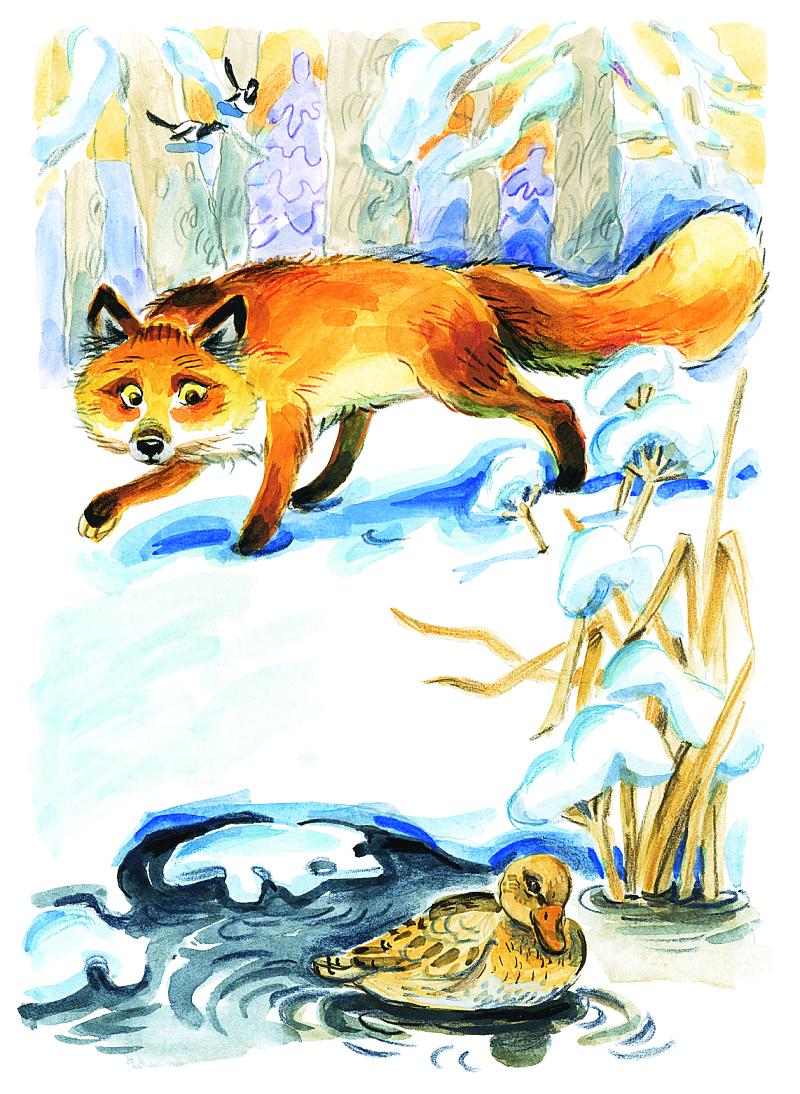 Лиса начала приходить каждый день – проведать, не застыла ли полынья. Наступившие морозы делали своё дело. От большой полыньи оставалось всего одно окно в сажень величиной. Лёд был крепкий, и Лиса садилась на самом краю. Бедная Серая Шейка со страху ныряла в воду, а Лиса сидела и зло подсмеивалась над ней: