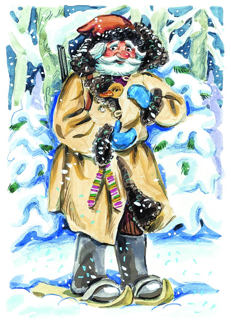 Действительно, опасность была на носу. На опушке леса стоял сгорбленный старичок охотник, который подкрался на лыжах совершенно неслышно и высматривал, которого бы зайца застрелить.