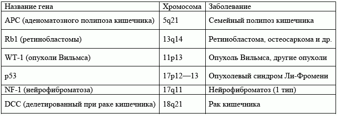 Ответственные за возникновение опухолей гены могут быть доминантными или рецессивными. Если ген является доминантным, то осуществляется синтез молекул, вызывающих образование опухоли. Если ген является рецессивным, то для развития опухоли необходимо отсутствие нормальных генов, необходимых для поддержания нормального контроля над ростом.