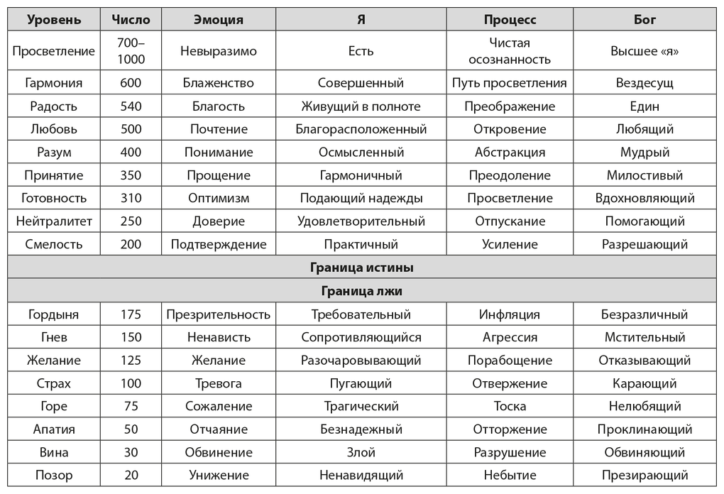 Дэвид разложил уровни сознания по тысячебалльной шкале, где двести – нейтральное положение. Всё, что выше, – это увеличение энергии, ниже – уменьшение.