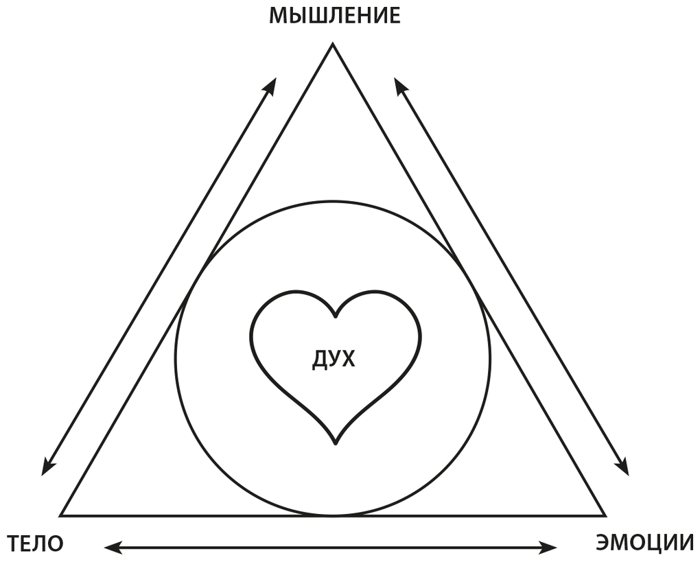 Это система, в которой тело, мышление и эмоции представлены как вершины треугольника. А в центре всего находится дух. Вершины строятся на основе наших ощущений, мыслей и чувств, поэтому мы способны влиять на них.