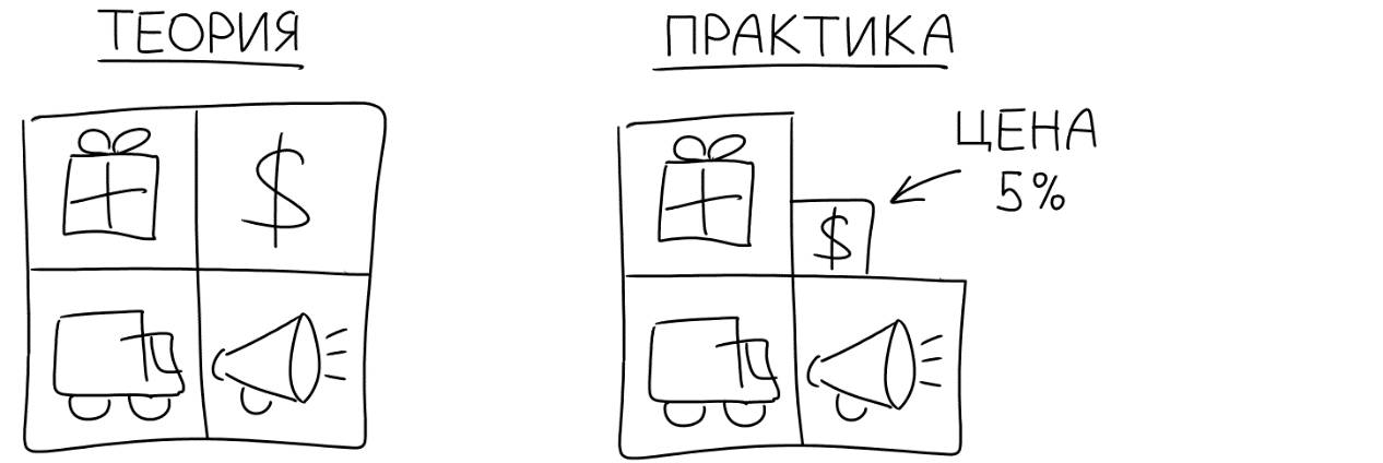 Со временем я стал понимать, что на самом деле ценообразование является одним из самых недооцененных инструментов маркетинга. Теоретически каждая из четырех частей маркетингового микса одинаково важна: примерно, как на рисунке 1. Однако в реальности ценообразованию уделялось не больше 5% внимания.