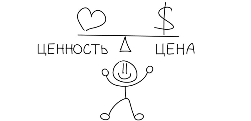 Как видите, благодаря описанию ценности продукта вам уже гораздо легче понять, адекватна ли цена. В мыслях человека происходит сравнение ценности продукта и его цены. Это как весы: на одной чаше выгода, которую вам может принести владение товаром, а на другой – цена, которую нужно заплатить. Если весы склоняются в правильную сторону, то есть выгода перевешивает цену, то вы осуществляете покупку, если же цена вам кажется завышенной по сравнению с выгодой, вы не покупайте товар.