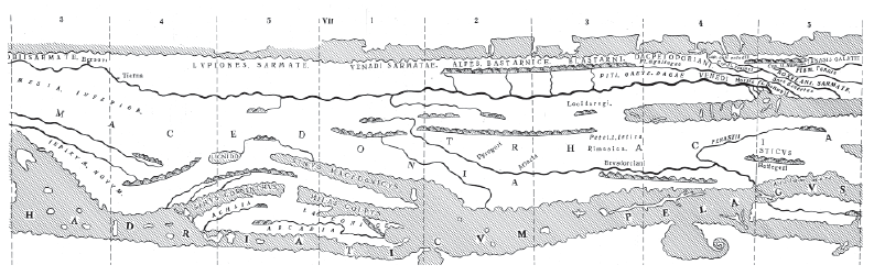 Еще в I в. до н. э. римский географ Страбон сообщал о племени «росхолан» (роксолан), живших на пространстве от берегов Днепра до берегов Дона. Известный римский чиновник и историк Гай Плиний Секунд Старший (23–79 гг. н. э.) среди варваров также называл роксолан и венедов, живших севернее Понта Евксинского (Черного моря) за Дунаем. Военная разведка римлян начала исследовать Сарматию (Восточную Европу) еще при императорах Клавдии и Нероне – между 41 и 68 гг. н. э. Уже в 68 г. н. э., еще до постройки валов Траяна, роксоланы ворвались в Мизию и разбили там римлян. Известный римский историк Публий Гай Корнелий Тацит (сер. I в. н. э. – ум. после 113 г.), в прошлом военный и консул, называл и соседей роксолан, родственный им, воинственный народ венедов, умевший хорошо сражаться в пешем строю. Но, пожалуй, наиболее яркую картину движения и расположения варварских народов Восточной Европы дал в своем «Географическом руководстве» римский географ Клавдий Птоломей (89—167 гг. н. э.). Он сообщал, что все свои сведения о Сарматии он получал в войсках Восточного Легиона (части которого базировались и в Таврии). Сообщения Птоломея относятся к 140 г. н. э. Среди других варварских племен Восточной Европы он называет сербов, саваров (северу) и борусков (скорее всего – самоназвание роского племени лесной и лесостепной полосы), живших восточнее Балтийского моря на Восточно-Европейской равнине. Названием, родственным имени этого племени, была обозначена греками и одна из крупнейших рек Восточной Европы – Борисфен (Днепр), а также одно из древнейших поселений на киевских высотах у Днепра – Боричев. В начале III века на официальной карте Римской империи (Tabula Peutingeriana – Певтингерова карта) появились значительные надписи: по левому берегу Дуная – «V E N E D I», а между Южным Бугом (Гипанисом) и Доном (Танаисом) – «R O X Y L A N I»[19].