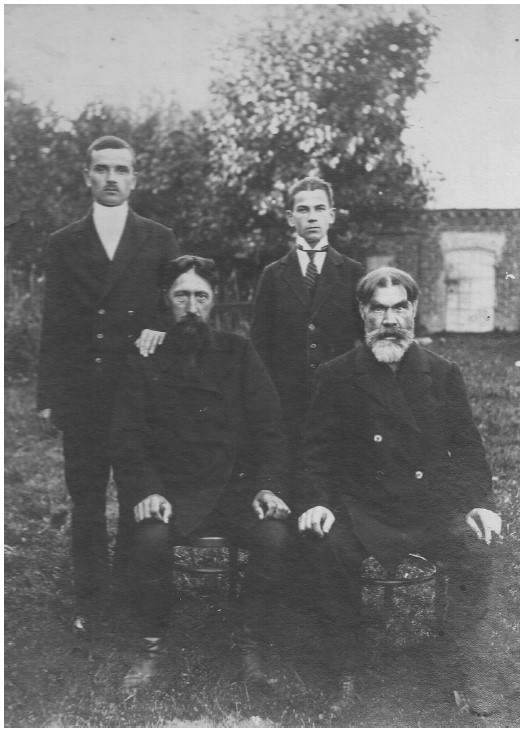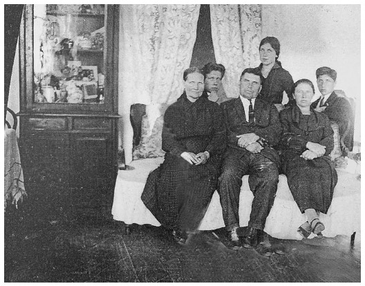 Тузовы и Урновы (слева направо) сидят Петр Алексеевич Тузов и Ефим Васильевич Урнов, стоят молодые Тузовы, впереди у них – раскулачивание.