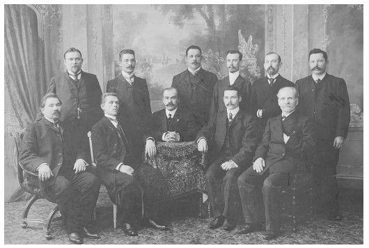 Машинисты депо станции Александровская Николаевской ж.д. Конец 1890-х годов. Никита Матвеевич Воробьев в первом ряду крайний справа, ладонь спрятана за лацкан – поранена при крушении.