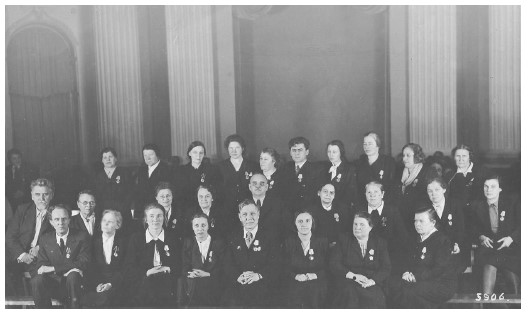 Группа советских учителей, награжденных орденами. Вручал Н. М. Шверник. Крайняя справа в первом ряду – Е.Ф. Тузова («Тётя Женя»).