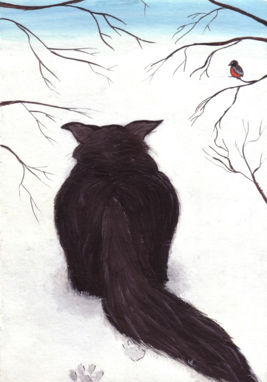 И вот неуклюже ковыляя по снегу и на ходу поправляя перья, не помня себя от счастья, синичка пошла на взлёт. Растерянный чёрный кот смотрел ей вслед, пытаясь осмыслить всё то, что произошло с ним этим утром.