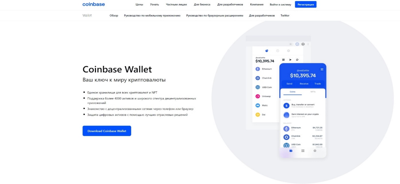 Coinbase Wallet. Перед нами простой интерфейс, радушно приглашающий вписать почту, либо номер телефона и придумать пароль. Кошелёк относится к криптовалютной бирже Coinbase, но для того, чтобы завести кошелёк на ней, регистрироваться не нужно.