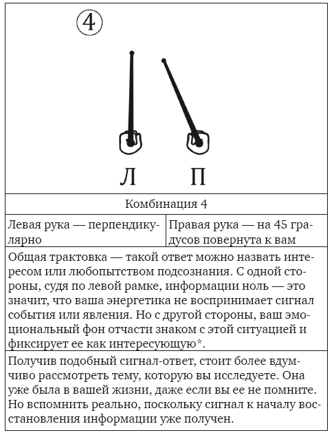 Получается, что обе рамки, а вернее, держащие их руки будут врать? – Возможно. И в некоторых вопросах «врать безбожно». Более того, левая и правая руки будут иметь разные «мнения» на одни и те же вопросы. И это нормально как с точки зрения строения нашего организма, так и с точки зрения оценки ситуации. И эти мнения/ощущения при верной и корректной трактовке позволят нам получить дополнительную информацию о происходящем – так сказать, дополнить скупую картину, которую предоставляют нам рамки, эмоциональной картиной подсознания.
