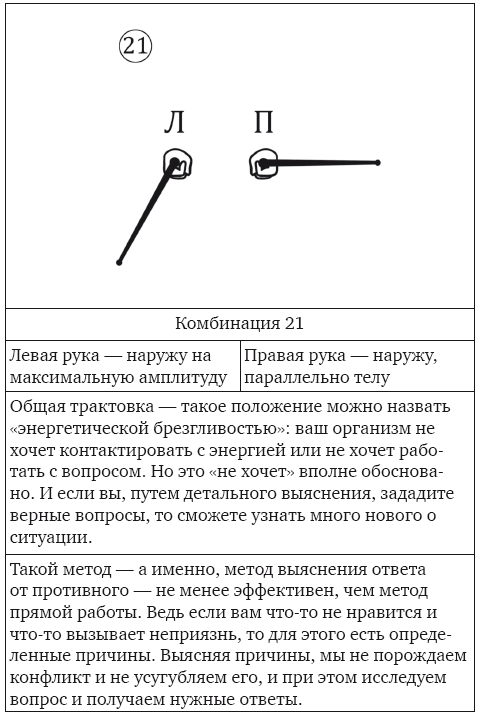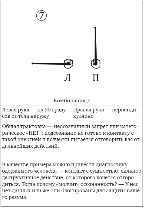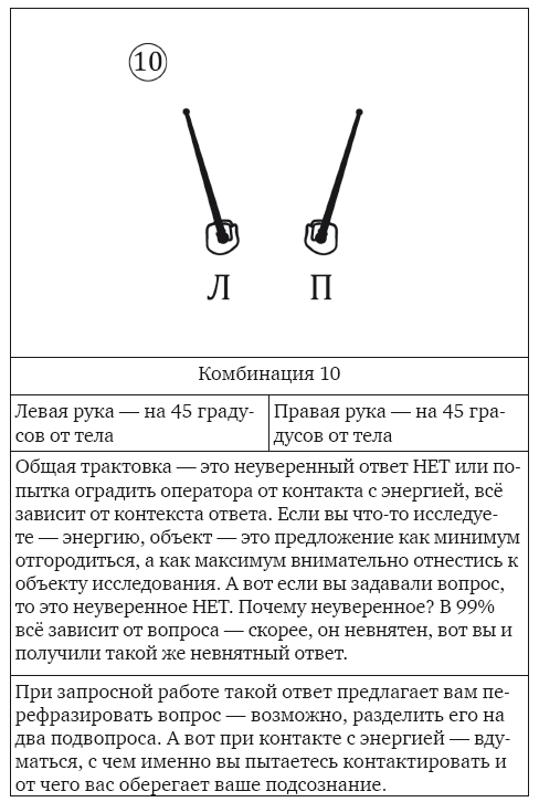 На рисунке вы видите основные расстановки рамок при диагностической работе. Точки 0 для обеих рамок – точки покоя, когда оператор собран, сконцентрирован и внутренне не реагирует на происходящее. Именно с этого положения начинается любая работа, и пока рамки не будут приведены в это положение (волей и настроем), продолжать работу не стоит.