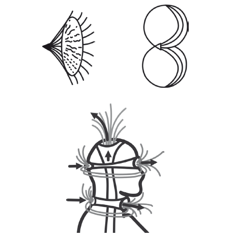 На рисунках ниже вы видите, что чакра представлена в виде воронки. Но это вид спереди – сзади она также является воронкой, но не отдающей, а поглощающей энергию[15]. Снаружи мы реализуем то, что у нас внутри, – свои стремления, желания, эмоции, формируем поступки. Сзади мы «поглощаем» то, что прошло через взаимодействие с окружающим миром – это наша энергия плюс энергия окружающего мира.