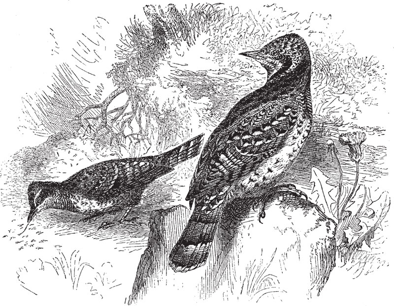 ЛИЗКО родственная дятлам, величиной немного поменьше жаворонка[35], буро-серая птичка, вся испещренная темно-бурыми крапинками, черточками и полосками. На верхней поверхности хвоста пять темных поперечных полосок; от затылка к спине тянется темно-бурая полоса; серовато-желтое горло украшено черно-бурыми поперечными черточками. Самец от самки по окраске почти не отличается.
