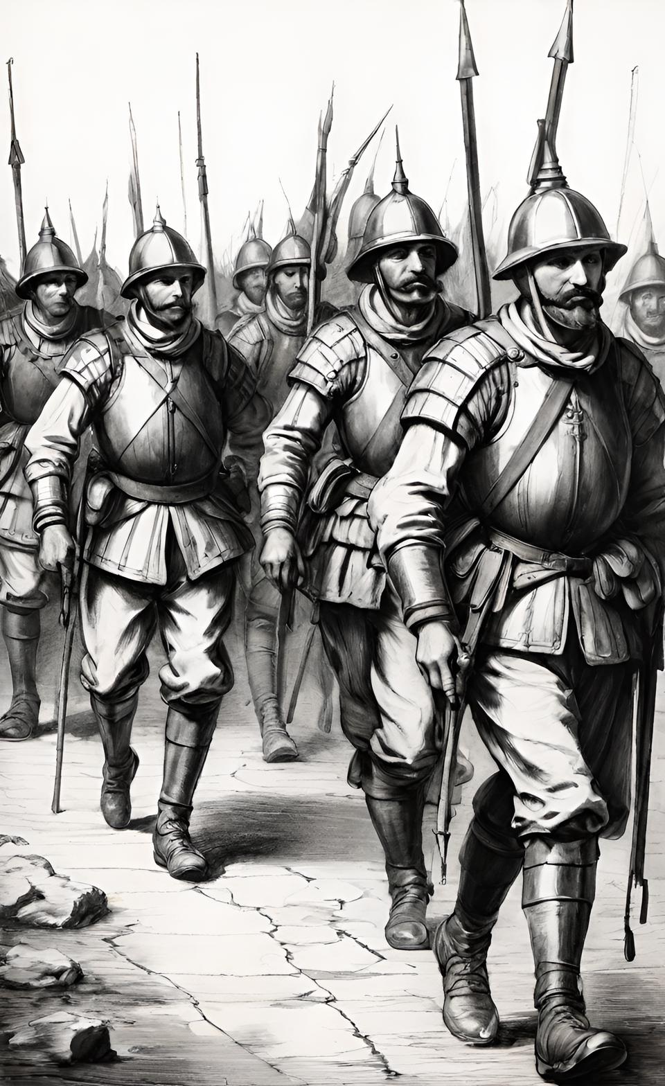 Они смотрели, как с песней идут, разгоняя факелами темноту, крепко сбитые шеренги солдат с мушкетами на плечах. Как огонь отсвечивает от кирас и шлемов отличной ковки, как прямо-таки пестрит их уставной, как ни странно, вид, и залихватские загнутые усы.