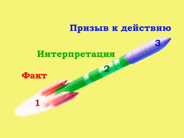 Эта структура – тоже «Ракета 1-2-3»Примеры предоставил, теперь расшифрую пункты. Для придания своим мыслям веса и значимости используйте факты. Любое суждение, агитация, призыв к действию также должны опираться на то, что можно реально подтвердить. Если в минуте игрока отсутствует факт, то речь считается выдумкой из воздуха, теряет основательность. Про такую минуту игрока говорят: «вода/высосана из пальца/взята с потолка».