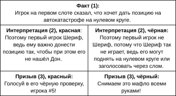 Тем не менее убеждение «Ракетой» не всегда стоит использовать. Оно прекрасно подходит, если вы Шериф или Лжешериф, если вы красный для всего стола и играете на допы, если вы чёрная проверка по одной из версий, т.е. определились с линией. За непроверенного игрока мафии и обычного мирного жителя я рекомендую использовать другие структуры10.