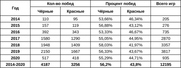 Представляю вашему вниманию статистику побед и поражений чёрной и красной команд по результатам живых игр и турниров в период с 2014 года по 2020 год по данным сайта mafbank.ru.