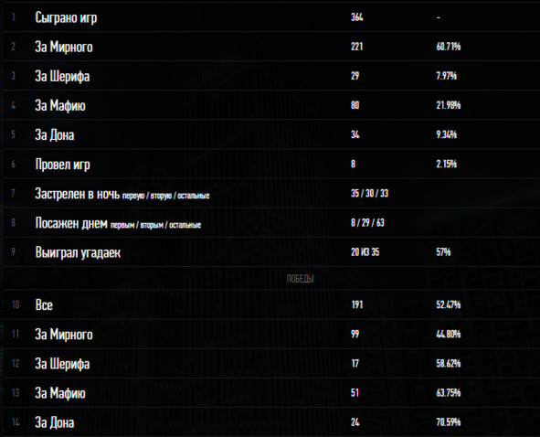 Скриншот ниже – мои данные, при которых могу считать себя если не топовым, то достаточно опытным игроком. На сайте inetmafia.ru за 364 игры 191 победа, что даёт 52,47% винрейта. Игровой псевдоним #Green. За каждую роль есть отдельные графы.