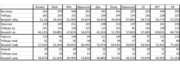 Проведя ряд простейших арифметических действий, вы можете убедиться, что винрейт лучших игроков в «Мафию» в среднем составляет 54,96%. Эта цифра значит, что топовые игроки побеждают меньше, чем в двух играх из трёх. А в среднем разница на дистанции между обычным и лучшим игроком состоит менее чем в одной выигранной партии из десяти!! (47,5% vs 55%). При том, что опыт каждого из гроссмейстеров игры «Мафия» составляет более трёх лет, а за плечами не одна тысяча сыгранных партий!