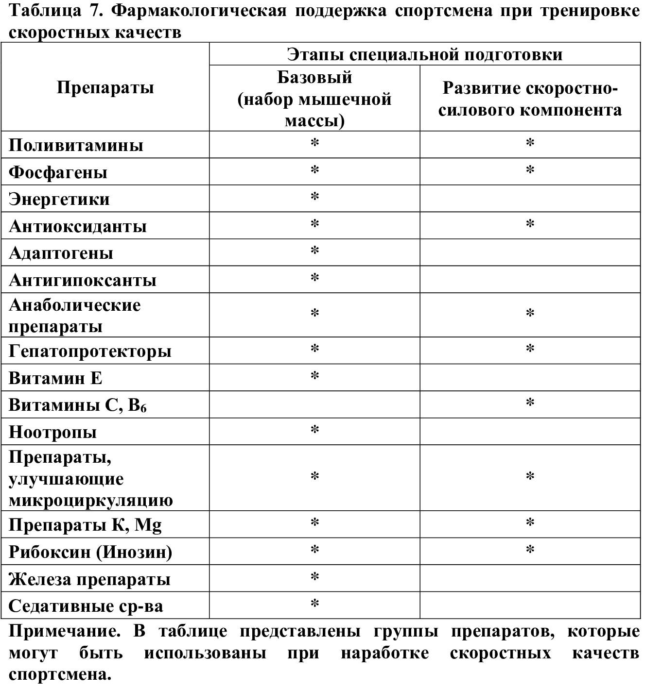 Фармакологическое обеспечение спринтерских возможностей спортсмена представлено в таблице 7.