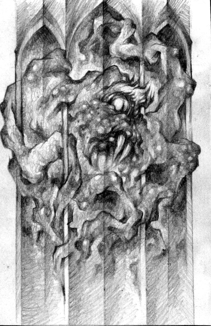 Фойл и гром пошли в соседний зал и когда стражник, стараясь не смотреть внутрь, открыл перед ними двери, юноша понял почему все придворные наотрез отказались сопровождать своего короля. В центре небольшого зала, служившего скорее всего туалетной комнатой королю, зависло Нечто, похожее на пористого слизня. В его чреве могло поместиться около пяти взрослых человек, но, судя по тому как Это, клокоча и булькая, расширялось и пульсировало, можно было предположить, что его размеры могли увеличиваться в несколько раз. К ужасному зрелищу добавлялась ещё чудовищная вонь, о происхождении которой можно было бы и не задумываться.