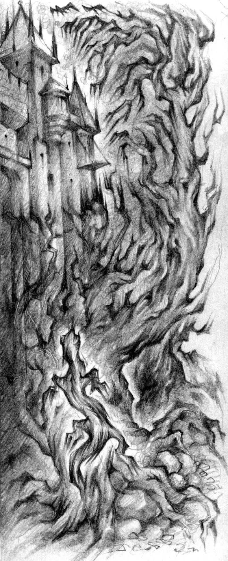 Вдруг непролазная чаща кончилась и перед юношей показалось подобие просвета. Он еле выбрался из дебрей леса и, отмахиваясь от мошкары, стал оглядываться. Между искарёженных, мёртвых, редко растущих деревьев возвышался мрачный замок колдуна.