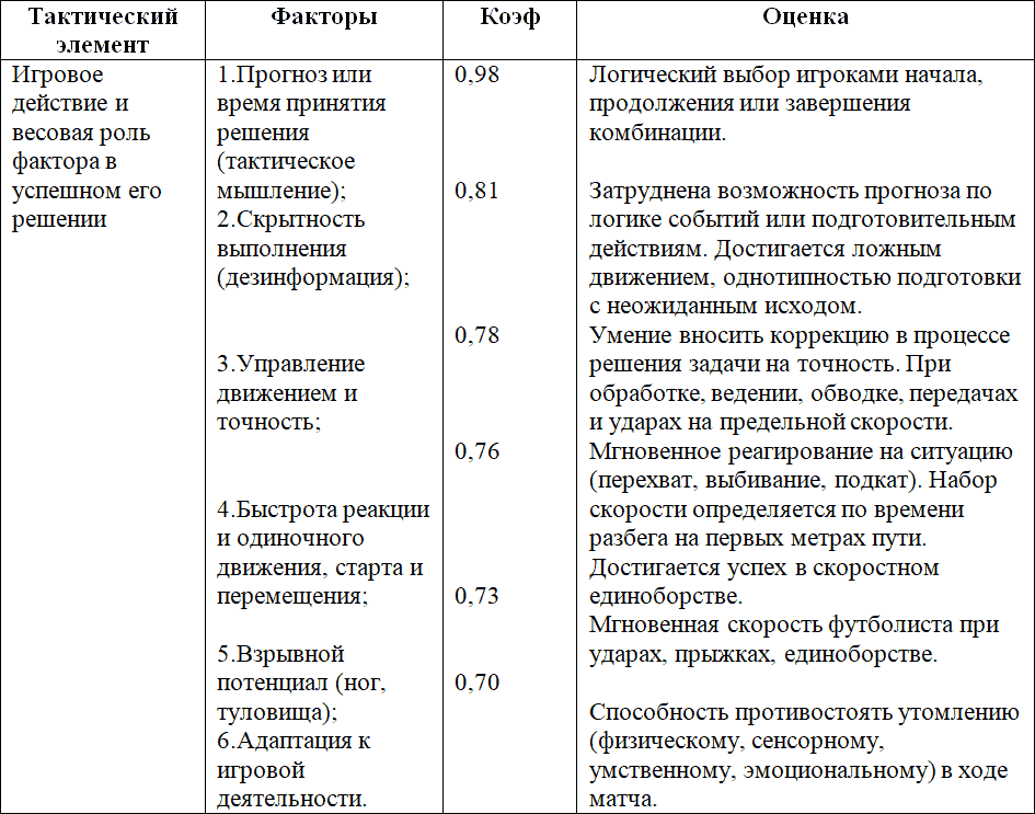 Таблица 1. Величина корреляционных связей между основными факторами и игровым действием