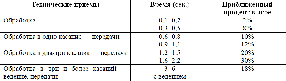 Таблица 2. Время владения мячом при выполнении технических приемов