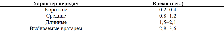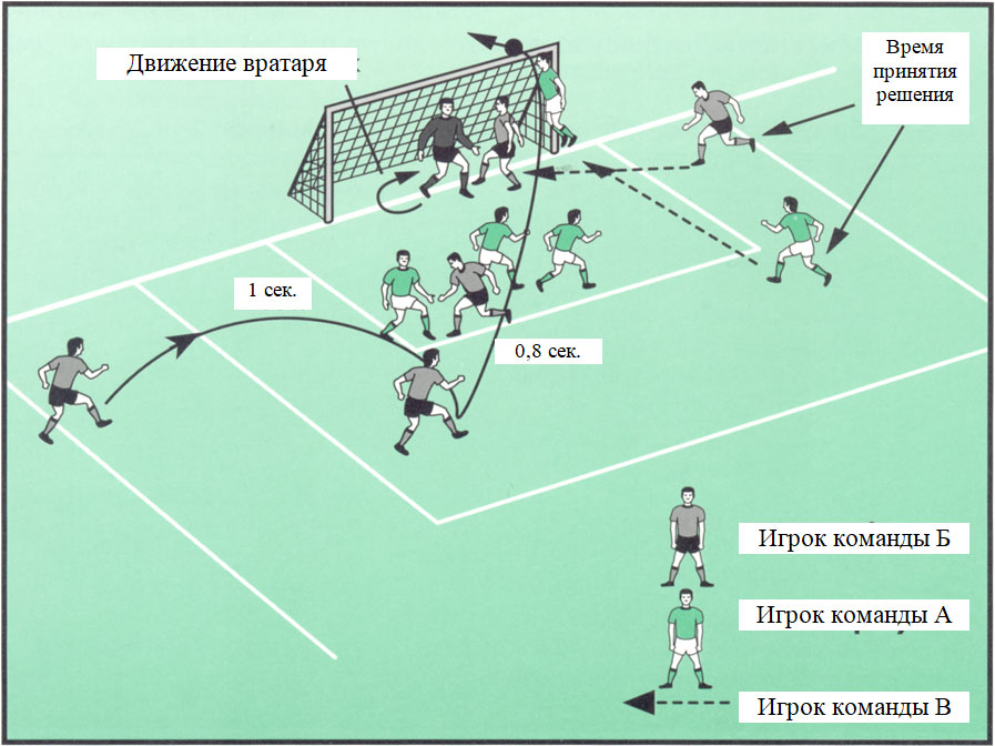 Рассмотрим взаимодействие игроков во временных характеристиках в некоторых типовых тактических фрагментах, возникающих в зоне у ворот.