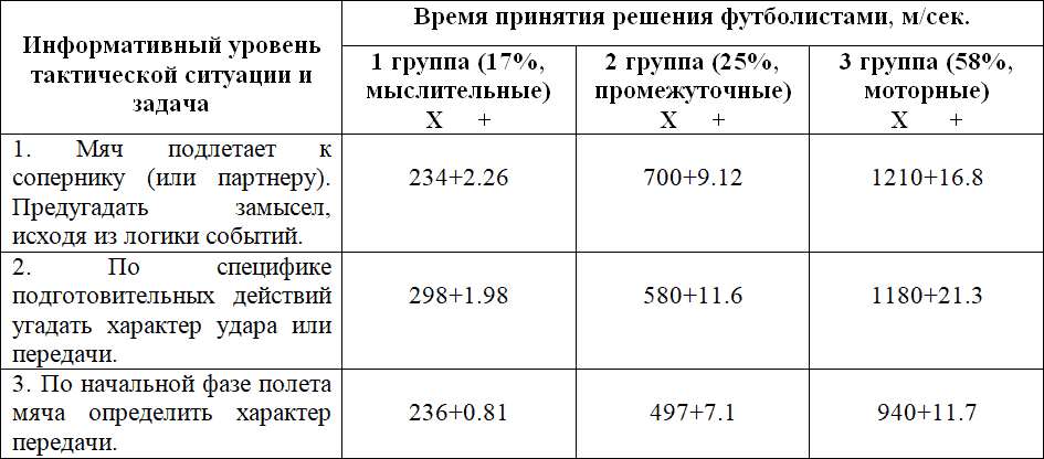 Возможность анализа динамики сенсомоторных характеристик игроков с помощью видеозаписи позволила сопоставить данные лабораторных испытаний с реальной (в ходе соревнований) результативностью принятия решений по выбору места при розыгрыше стандартных положений, а также при обработке мяча после передач при жесткой опеке, перехватах и т.д. В этих случаях выигрыш достигался не за счет быстроты, а за счет прогноза, создающего условия для более раннего начала игрового действия. При сопоставлении данных обнаружена корреляционная зависимость между лабораторными испытаниями и временем принятия решения в процессе соревнований. Так, у футболистов мыслительного типа время принятия решения находится в пределах 380–436 м/сек., а коэффициент связи К=0,87. У футболиста мыслительно-моторного типа (время принятия решения от 416 до 1300 м/сек.) наблюдается уменьшение связи (К=0,60). В третьей, моторной группе время принятия решения от 1120 до 1610 мсек. при низком коэффициенте корреляции (К=0,49). Данные эти достоверны при условии определенного уровня развития двигательных возможностей и умения адаптироваться к скоростно-силовой работе. При этом анализе мы не учитывали, однако, случаи, в которых наблюдалась пассивная передача мяча в различных зонах поля.
