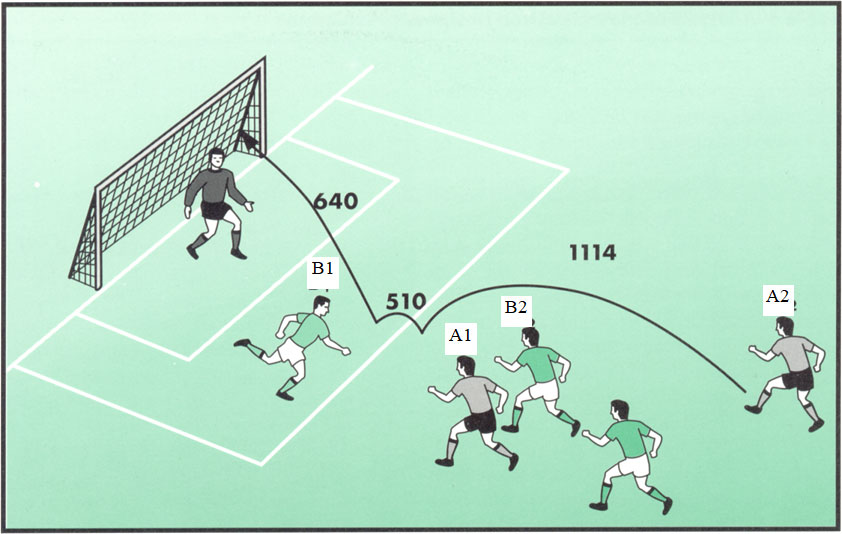 Второй типичный случай, который мы хотим рассмотреть, связан с быстрым, неожиданно организованным прорывом. Центральный нападающий А1 (рис. 3) определил по логике развивающихся событий оптимальный вариант передачи и сделал рывок вперед. Угадав замысел центрфорварда, игрок А2, находившийся сзади, недалеко от центральной линии, направил ему мяч. Время полета составило 1114 мсек. За эти мгновения первоочередной задачей игрока А1 являлся выигрыш скоростного единоборства у защитника В2 с последующим бесконтактным обходом игрока обороны – В1 с целью сохранения набранной скорости. Однако защитник В1 слишком долго принимал решение (в течение 950 мсек.) и потому запоздал с нейтрализацией действий А1. Обойдя соперника В2 за счет быстрого реагирования, центрфорвард обработал мяч с лета на скорости, а затем, после отскока, еще одним движением внес коррекцию в положение мяча по отношению к ноге и выполнил удар правой. Эти действия оказались неожиданностью для вратаря, который не успел принять контрмеры, и пропустил гол. Добавим, что все это происходило на первых минутах важнейшей международной встречи.