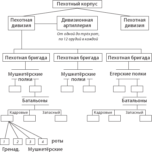 Каждый полк теперь состоял не из трёх батальонов – двух кадровых и одного запасного, служащего для подготовки в составе полка рекрутов-новобранцев. Это позволило готовить пополнение прямо в рядах полка и обеспечивало лучшее вливание в кадровый состав. Численность гренадерских и мушкетёрских полков должна была по штату составлять 2256 строевых и 232 нестроевых, егерского – 1385 строевых и 199 нестроевых. В составе дивизии егеря насчитывали менее 1/4 численности пехоты, хотя и составляли 2 полка из 6. Таким образом, для ведения огневого боя в рассыпном строю предназначалось примерно 25 % пехоты, тогда как остальная должна была в атаке действовать в основном штыком, а в обороне – штыком и огнём в развёрнутых трёхшереножных линиях.