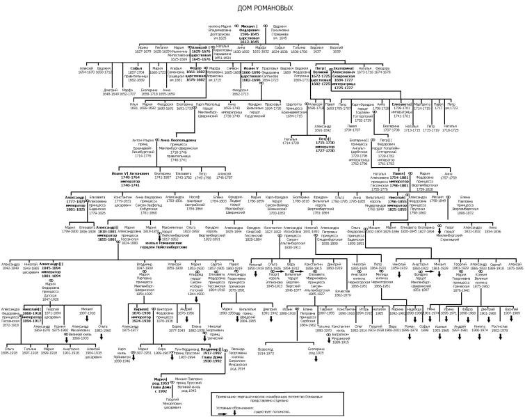 Самым ярким примером будет генеалогическое древо рода Романовых. Оно насчитывает огромное количество людей, по нему можно проследить все связи, нынешних потомков и наследников. Это настоящий шедевр родословия.