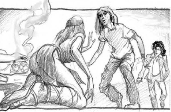 И увидел прямо перед собой, как тело незнакомой девушки сползло с ветрового стекла, оставляя за собой кровавые подтёки. Вот оно упало вниз, под колёса машины. Рокер вскрикнул от ужаса и выскочил из машины. Он повернул к себе залитое кровью лицо незнакомки и затряс её за плечи.