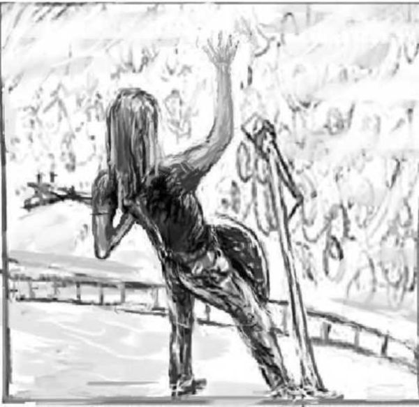 Те, кто пробился к подиуму, срывали с себя стринги и швыряли их рок-звезде. Стринги цеплялись за длинные иглы венка и повисали на них, как ёлочные украшения. Двое трансвеститов стояли обнявшись. Руки их нежно поглаживали бедра друг друга. Они восхищённо глядели на своего кумира. Тот, кто был одет в женскую одежду, на высоких каблуках, охваченный массовой истерией тоже попытался снять свои стринги. Но, они зацепились за каблук. Падая, «она» вовремя была подхвачена своим бой-френдом.