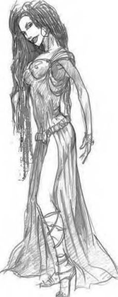 Туфли на сверхвысоких каблуках с плетёнкой, добавляли достоинства её фигуры. На плече, красовалась наколка с изображением Сирены. Длинные серьги в ушах, перстни, и другие украшения из золота представляли собой изображения древней символики.