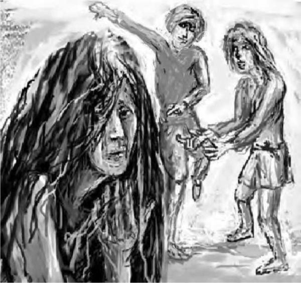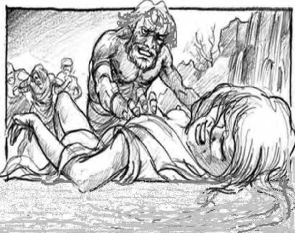 Молодой человек лежал рядом с другими людьми из каравана. Все они были связаны верёвками. Но, в отличие от других, сдавшихся на милость захватчиков, он времени не терял. Пока все зелоты наблюдали за своим атаманом, жених, изловчившись, дотянулся до узлов и развязал их зубами. Он вскочил на ноги. Сбил с ног молодого разбойника и, выхватив у того нож, бросился к атаману.