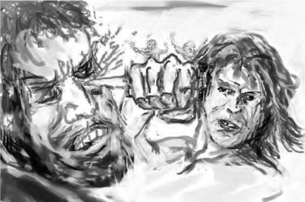 – Любо-о-вь… Что ты в этом смыслишь, придурок! Тебе бы только брюхо набить Он ударил второго слепца клюкой. Второй слепец не стерпел такого хамства. Он приподнялся и ударил палкой в ответ. Слепцы стали размахивать клюками, пытаясь попасть в противника.