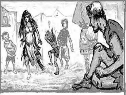 На окраине города, у колодца, стояли люди в очереди за водой. Переговариваясь и смеясь, мимо них пробежала стайка мальчишек. Навстречу, по дороге, брела бесноватая нищенка. Грязная, изодранная одежда, свисавшая бесформенными хлопьями, не скрывала её огромного живота. Спутанные длинные пряди волос закрывали лицо. Она постоянно накручивала волосы на свои пальцы и что-то пела, причитая тихим голосом.