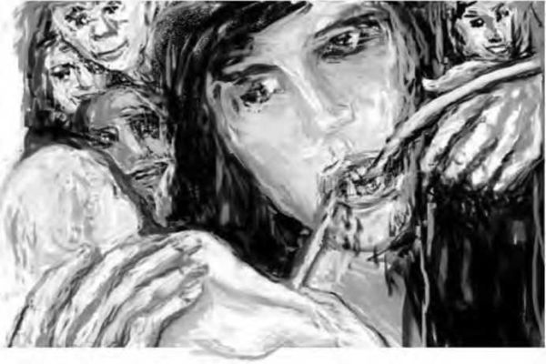 Один из них, особенно наглый, стал перед женщиной, преградив ей дорогу и, кривляясь, запел: – Ау, моя невеста! Посмотри на меня, красавица моя. Я вернулся к тебе. Ну, что, не узнаёшь? Это же я, твой милый. Приди ко мне, любовь моя… – и он протянул к несчастной руки. Его товарищи ржали, ухватившись за животы.